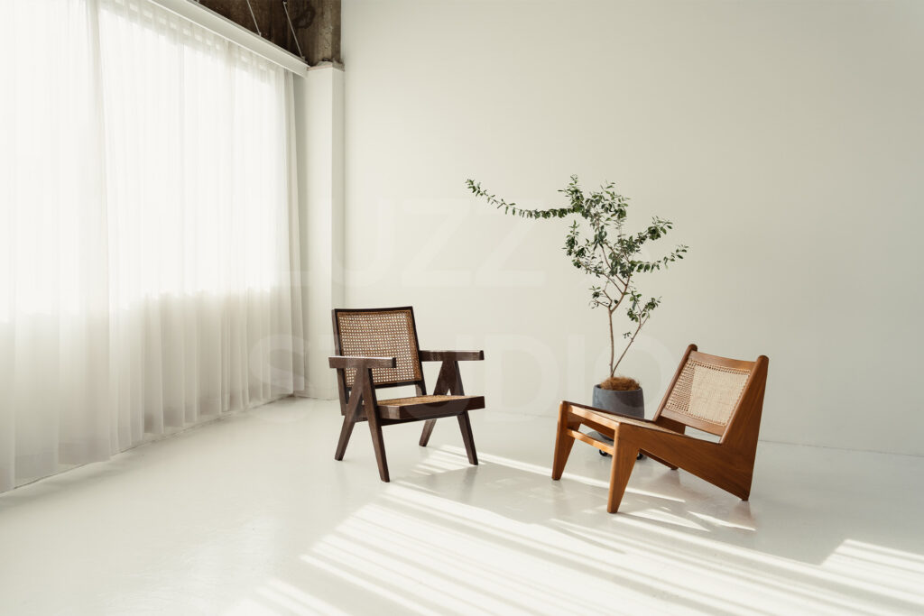 白壁はモデルの色味を邪魔せず、無垢材は温かみを与えるため、
